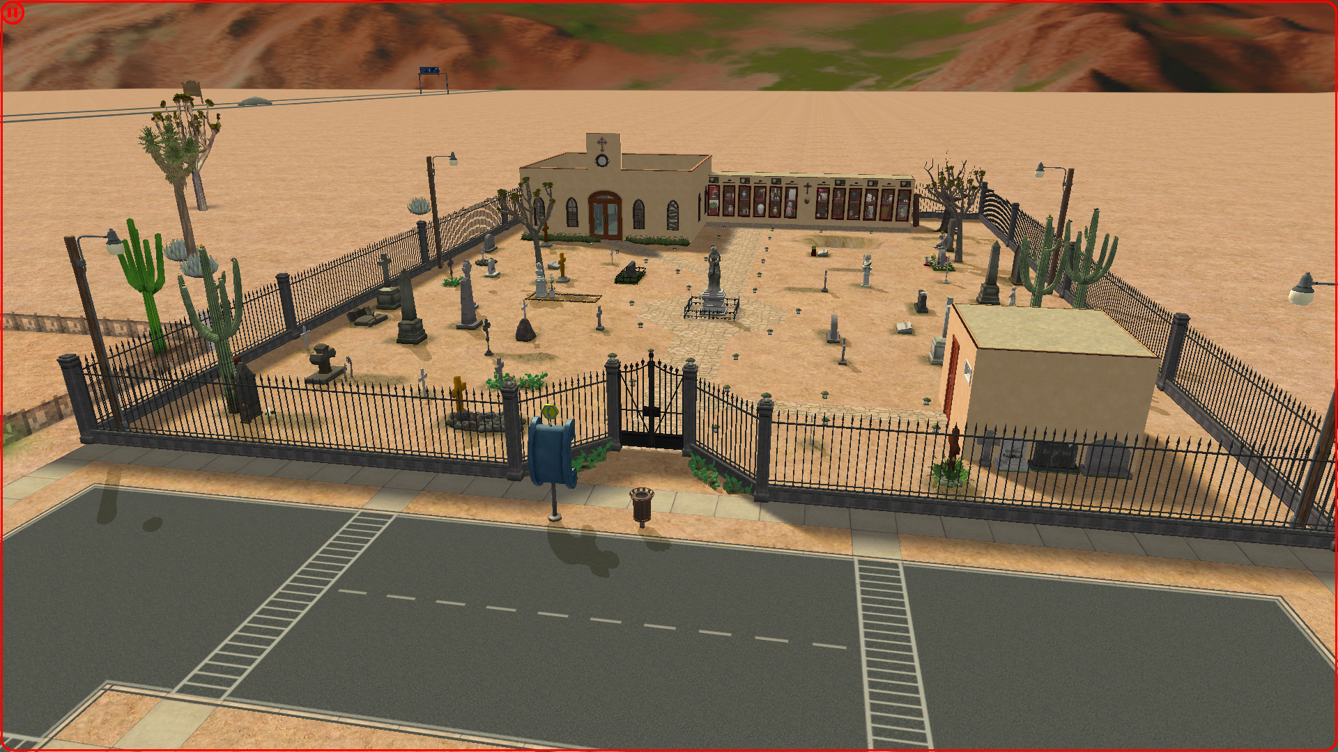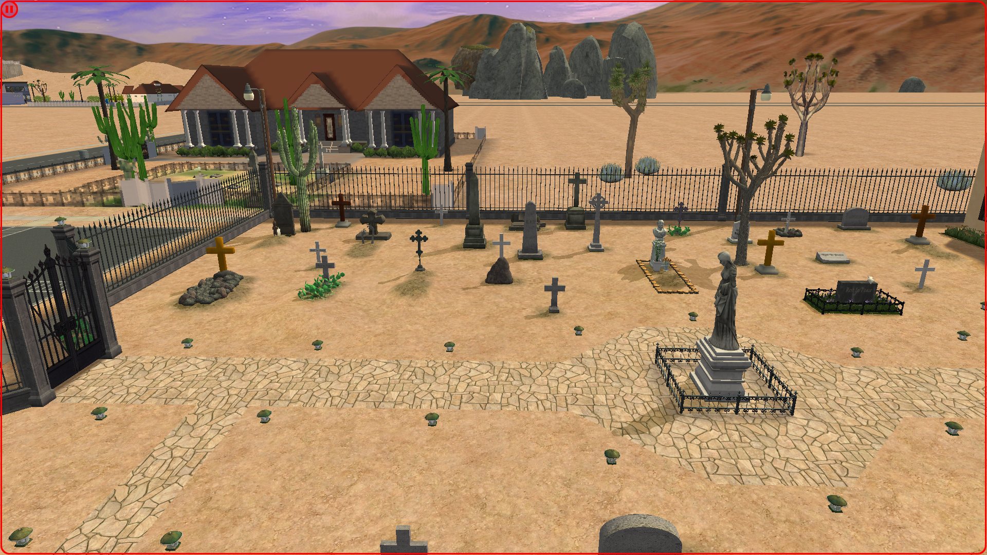 For now, here’s a cemetery I build for Strangetown (and placed it near Olive Specter’s house, of course). I downloaded lots of CC crosses and gravestones, but I intend to replace most of them with actual gravestones and urns when my Sims start to die.